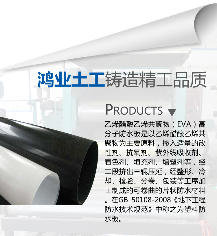 乙烯醋酸乙烯共聚物(EVA)高分子防水板是以乙烯醋酸乙烯共聚物為主要原料,摻入適量的改性劑、抗氧劑、紫外線(xiàn)吸收劑、著色劑、填充劑、增塑劑等,經(jīng)二段擠出三輥壓延,經(jīng)整形、冷卻、檢驗(yàn)、分卷、包裝等工序加工制成的可卷曲的片狀防水材料。在GB 50108-2008《地下工程防水技術(shù)規(guī)范》中稱(chēng)之為塑料防水板。與PE相比,EVA由于分子鏈上引入醋酸乙烯(VA)單體,從而降低了結(jié)晶度,提高了柔韌性、耐沖擊性、與填料相容性和熱密封性,并具有較好的耐環(huán)境應(yīng)力開(kāi)裂性,良好的光學(xué)性能、抗化學(xué)腐蝕等優(yōu)點(diǎn),且無(wú)毒、不吸水。施工工藝簡(jiǎn)單,可操作性好,可修補(bǔ)性強(qiáng)。對(duì)施工環(huán)境要求低,特別適用于隧道、管道等狹小空間及通風(fēng)條件差和有滲透水的環(huán)境施工。